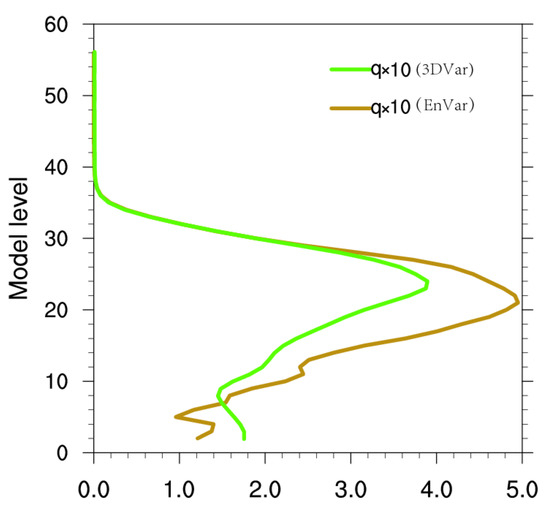 Figure 10 is the RMSD profile of the analysis increment of specific humidity enlarged by 10 times based on the whole model domain. The value of RMSD reflects whether these model layers are sensitive to assimilation. It should be mentioned that the humidity increment of the CONV experiment is rather small (not shown). It can be found that both the 3DVar experiment and the EnVar experiment have a peak at the middle layer of the model. However, the maximum humidity increment of the EnVar experiment is around 0.5 g/kg, which is 0.1 g/kg greater than that in the 3DVar experiment. The results are consistent with the 850 hPa relative humidity increment in Figure 9.