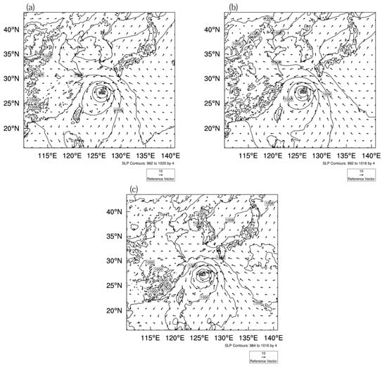 Sea level pressure (contours, unit: hPa) and surface wind field (vectors, unit: m/s) of (a) the CONV experiment, (b) the 3DVar experiment, and (c) the EnVar experiment at 0600 UTC on 21 July 2018.