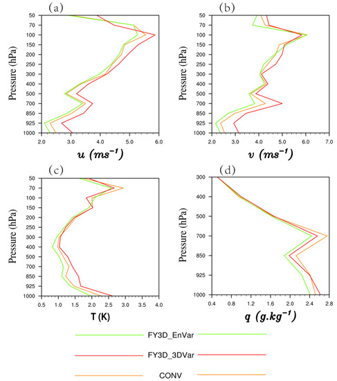 The forecast errors are assessed in Figure 12 versus the conventional observation averaged from 24-h forecasts initialized from each analysis. For the wind components, the RMSE at the low and middle layers are small, while the RMSE at the high layers are large. In contrast, the feature of specific humidity is totally different from them. In addition, the RMSE of temperature at the middle layer are small. However, the RMSE at low and high layers are large. Generally, the RMSE of the 3DVar experiment are smaller than the CONV experiment, but the values are relatively higher than that in the EnVar experiment, which denotes that the forecast errors of the EnVar experiment are the smallest.