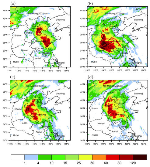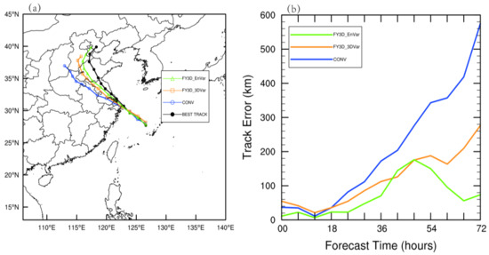 Figure 13 shows the track of all the experiments in the 72-h deterministic forecast initialized from 0600 UTC on 21 July. It should be mentioned that the best track dataset is collected by the CMA [49,50]. Initial track errors exist in all experiments at the beginning time, as expected in the background. It can be found from Figure 13b that in the first 12 h, the forecast track errors of all experiments are reduced slightly. The forecast errors increase gradually with forecast leading time for the first 54 h. The track errors of the 3DVar experiment are also increasing with the forecast hours for all the forecast hours, while the track error of the CONV experiment increases more notably. However, the track error of the EnVar experiment decreases after 48 h, yielding a nearly consistently smallest track error with a maximum of about 180 km.