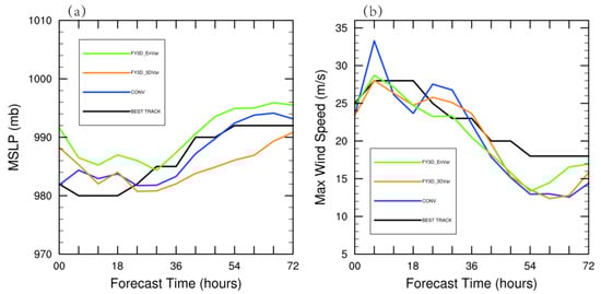 Figure 14 shows the MSLP and the maximum surface wind speed of all experiments in the 72-h deterministic forecast. It can be found that the overall trend of the three experiments is consistent with the observation. The MSLP forecast error of the EnVar experiment is smallest with a magnitude less than 4 hPa after 30 h’ model integration, although there is an obvious stronger positive deviation compared with CONV and 3DVar for the first 24 h. In addition, the Max Wind Speed of the EnVar experiment matches best with the best track in the first 42 h with its maximum error of less than 3 m/s. With the integration of the model, the forecast of maximum surface wind speed in three experiments is obviously lower than the observation after 42 h. According to Figure 13 and Figure 14, it can be found that the intensity prediction of EnVar has less improvement than the track prediction when compared with 3DVar and CONV.
