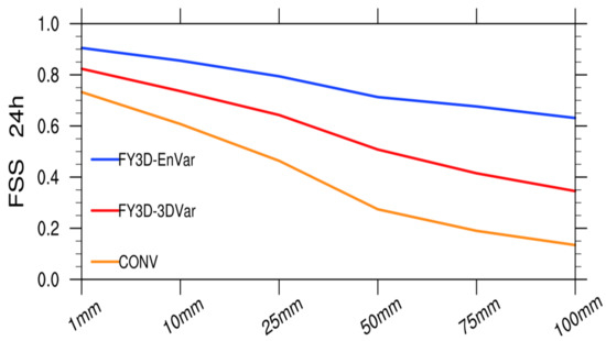 In order to make an objective estimate on the forecast skill of the three experiments, the fraction skill score (FSS) is employed [51]. Generally speaking, the higher the FSS score, the better the forecasting skill. Figure 16 is the 24-h FSS of all experiments. The FSSs of the 3DVar experiment at each threshold are higher than those of the CONV experiment, while the EnVar experiment has the highest scores at each threshold. For small threshold values, the advantage of the EnVar experiment is not obvious since the difference between the two experiments is small, especially below 25 mm. For thresholds over 50 mm, the advantage of it is evident.