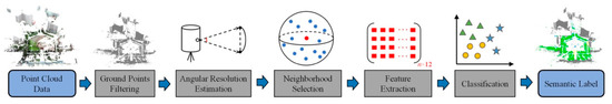 The proposed method mainly includes four steps: ground filtering, angular resolution estimation, feature extraction, and classification, as shown in Figure 1. Firstly, we use Cloth Simulation Filtering (CSF) [51] to extract ground points. Then, the angular resolution is estimated by NARP for non-ground points. In the step of feature extraction, some commonly used multi-dimensional geometric features [14,19,20,30,52] are extracted for each non-ground point, with traditional projection density replaced by relative projection density. Finally, a Random Forest (RF) classifier is used to label each point and evaluate feature importance.