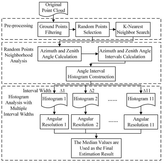 where θar and αar are the estimated horizontal and vertical angular resolution, and θar(Δθi) and αar(Δαi) are the estimated result from the histogram constructed with interval Δθi and Δαi.