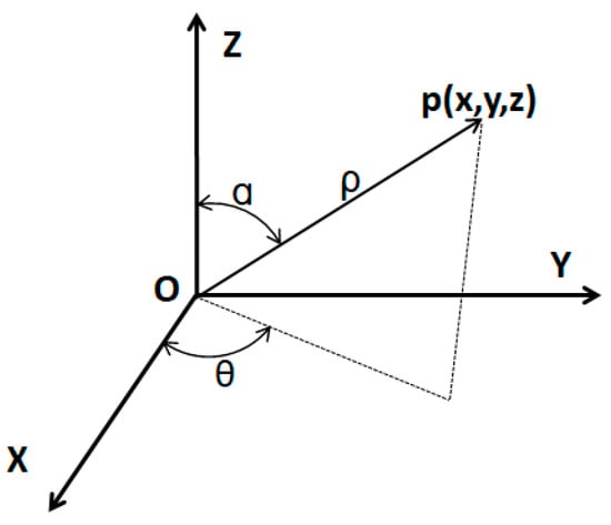 where (x,y,z) and (ρ,θ,α) are the rectangular and polar coordinates of one point, respectively. As shown in Figure 3, θ is the azimuth angle with a range of [0°, 360°] and α is the zenith angle with a range of [0°, 180°].