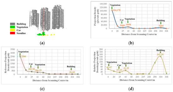 We illustrate the relative projection density with an example in Figure 6. A scanline is selected, which includes close vegetation, a car, and a distant building, as shown in Figure 7a. In this scanline, we analyze the variation of three types of projection density in terms of distance, including traditional projection density (Ngrid), reference projection density (Nref in Equation (14)), and relative projection density (Nrd in Equation (13)), as shown in Figure 7b–d. The building is commonly considered to have a larger projection density than other objects; however, due to the effect of scanning distance, the traditional projection density of small-size objects at close range may be larger than a building at a distance. As shown in Figure 7a,b, although the surface area of the building is much larger than the vegetation, the traditional projection density Ngrid of vegetation at 4 m and 43 m is much larger than the building at 300 m from the scanner. This phenomenon demonstrates that the traditional projection density Ngrid is not effective enough to distinguish those objects. In contrast, the relative projection density (Nrd) is valid even though the building is far away from the scanner. In this manner, vegetation, a car, and a building can be distinguished by calculating the relative projection density, as shown in Figure 7d. The variation is consistent with the object geometry, which can correctly reflect the ground truth. After feature extraction, the relative projection density is combined with other commonly used geometric features to construct a 12-dimensional feature vector, and the semantic label is generated using Random Forest.
