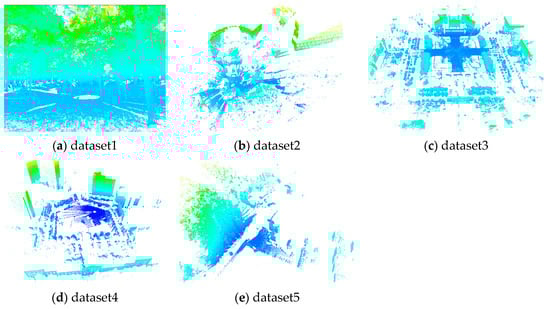 The proposed method is tested on five datasets collected with different scanners and angular resolutions, as shown in Figure 8. The first dataset is captured under a forest scene, in which high trees are the main targets, while the others are captured under an urban environment with man-made objects and mixed with vegetation. The detailed information is shown in Table 2, including the scanner, the point number, and the setting of the angular resolution.