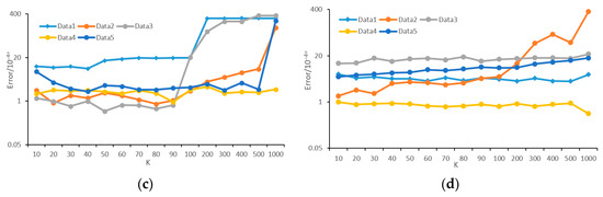 Estimation error with different parameter settings. (a) error of horizontal angular resolution with N, (b) error of vertical angular resolution with N, (c) error of horizontal angular resolution with K, (d) error of vertical angular resolution with K.
