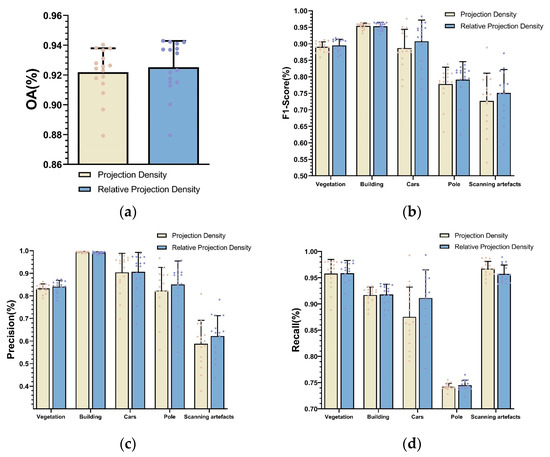 In terms of class level, it becomes visible that an improvement in performance can be observed especially for the small-size objects, such as cars, poles, and scanning artifacts. Using relative projection density instead of traditional projection density increases the F1-Score of cars, poles, and scanning artifacts by 2%, 1.34%, and 2.43%, respectively. The visual inspection of the derived results also demonstrates the effectiveness of the relative projection density in poles, scanning artifacts, and cars (Figure 15a–c) considering the density variation. Our approach shows better performance on the OA, F1-Score, and Recall value of poles, which are 0.27%, 1.34%, and 2.66% higher than the traditional method, respectively. We can also observe in Figure 15a that some vegetation points and building points are misclassified as poles. The probable reason for this error is that the object geometry of vegetation (trunk points) and building façade are similar to some parts of poles. Better discrimination is achieved for the classification results of relative projection density, the F1-Score, and the Precision of scanning artifacts are 2.43% and 3.43% higher than those of the method using the traditional projection density feature, and the local visualization result is shown in Figure 15b. The F1-Score and Precision value of scanning artifacts correspond to the worst results for both two features. This may be caused by moving objects during the scanning, and their object geometry with different postures may not be learned enough from the training samples. As shown in Figure 15c, most car points are misidentified as vegetation in the method using traditional projection density, while our method has fewer error points. It can be seen in Figure 15d,e that there is an improvement in the recognition of vegetation and building, although it is not reflected obviously in the quantitative results in Figure 13. The possible reason is that the vegetation and building have much larger point numbers than other classes and the detailed improvements are not obviously reflected on the evaluation metrics as small-size objects. In summary, compared with the method using traditional projection density, our method achieves better performance on small-size objects and similar performance on buildings and vegetation in terms of qualitative and quantitative analysis. That means considering density variation in feature extraction is helpful for improving classification results.