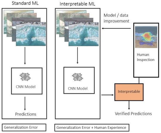 In the present study, we will investigate the usefulness of interpretable AI, particularly in the context of model improvement. We will also highlight some of the advantages of supervised learning through deep learning techniques such as CNNs and their ability to learn from experience and learn complex dependencies and features to derive a set of model weights/parameters that produces maximum accuracy. CNNs also require less human input, which is advantageous over traditional image-processing techniques, for which thresholds need to be defined. As many AI algorithms such as CNNs have many tunable parameters, they require a large amount of training data. A lack of diversity in training data can also result into poor model generalization, and in the context of rip current detection, models require training data from beaches representing a wide variety of different environmental settings. While the amount of data required for training CNNs can be extremely large (which could practically be unobtainable), there are many approaches to overcome this and reduce overfitting. For example, data augmentation increases the amount of training data by manipulating each individual image through a series of translations such as rotations and perspective transforms. Additionally, transfer learning has become a widely used technique for training AI-based models on small datasets, where an AI-based model is first trained on an extremely large dataset and then finetuned on a smaller dataset.