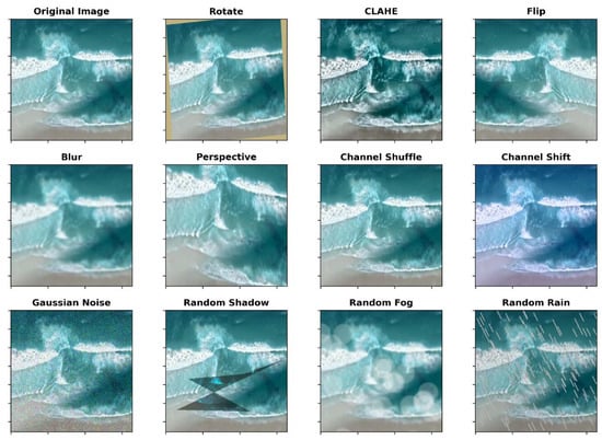 For example, when initially training the AI-based model, it struggled with oblique images. Thus, perspective transforms and translations were introduced as augmentations schemes. Some examples of data augmentation are provided in Figure 5 through the ‘albumentations’ python library []. Additionally, it was found that introducing random shadows, and random rain and fog, were useful for mitigating issues illustrated in Figure 3. Systematic inaccuracies were also found in images where the beach occupied a large portion of the image. These problems were mitigated through the comprehensive augmentation scheme, as described in Table 2. For example, to generalize to domains consisting of rocky outcrops we found techniques such as channel shuffling and channel shifting (constant value is added to each channel) as the most effective augmentation technique. While the training dataset does consist of rip currents within proximity to rocky outcrops, we found it would fail in almost all instances where rocky outcrops or dark objects occurred within the test dataset. We find that the channel shuffling and shifting reduces the importance of background color to the CNN, thus helping it generalize better. Additionally, the introduction of the perspective transformations dramatically improved the model accuracy and its ability to localize rip currents that were from oblique angles. Perspective transformations aim to distort the view of the original images so that we can synthetically generate these images from an alternative perspective. Overall, we found this augmentation to be the most important for model generalization.