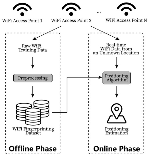 The basic architecture of a classic WiFi indoor fingerprinting system. This system has two phases: the offline phase and the online phase. In the offline phase, the WiFi signal measurements are collected, preprocessed, labeled and stored in the dataset. In the online phase, the WiFi measurements received by the user from an unknown location are compared with the measurements in the database by the positioning algorithm to obtain the final location estimation.