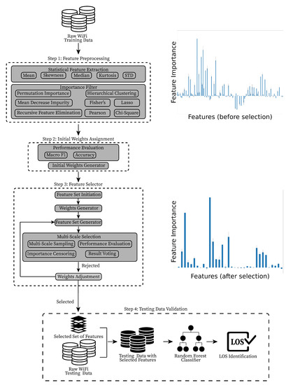In the preprocessing stage of the proposed framework, statistics of the input WiFi RSS and RTT measurements were computed and fed into an importance filter. Several popular feature selection models were used in the importance filter to decide their own feature set based on different algorithms. Then, statistical features chosen by feature selection models were assigned initial weights based on their macro F1 score and accuracy in LOS identification. To validate the selected features from both macroscopical and microscopical perspectives, multi-sampling datasets were introduced. Based on the performance of the selected feature set, weights adjustment was leveraged to reselect the features recursively. To evaluate the performance and transferability of the proposed algorithm, a large-scale real-world campus building floor was used as the testbed. Each location in the dataset was manually labeled and verified for ground truth. Since the framework only focuses on reducing high-dimensional data based on the relevance between input signal measures and the output, it could be applied to other signal measurements in indoor positioning.