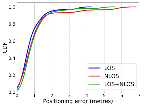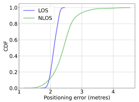 For ultra-wideband systems (UWB), in ideal LOS conditions, the positioning accuracy was widely reported to be at the centimeter level [23,24,25,26,27]. Researchers have also attempted to address NLOS conditions for UWB indoor spaces. In [28], recursive decision tree learning was used to exploit the UWB data for LOS detections. The CIR information extracted from UWB signals was taken into consideration. Machine Learning methods were leveraged to mitigate for the deviation of NLOS UWB measurements [29]. In [30], multi-layer perceptron and CNN were used to make predictions. The 2D Time Difference of Arrival (TDoA) framework based on deep Q-learning was proposed in [31] to make efficient LOS node selection. The system in [32] introduced Morlet wave transform (MWT)to make LOS detection based on time-domain characteristics. Table 1 compares the performance of LOS identification in different systems.