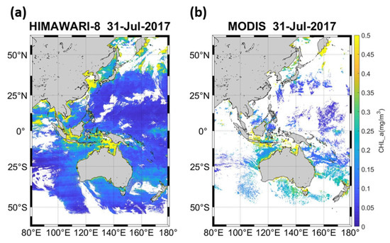 Daily Chl-a composites on 31 July 2017 retrieved from (a) AHI/Himawari-8 and (b) merged MODIS Aqua-Terra.