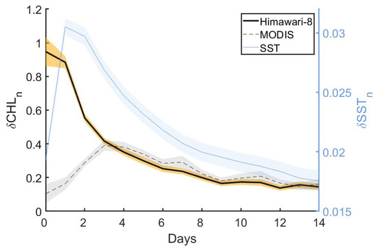 Figure 4 shows the composited temporal progressions of Chl-a (and SST) changes in response to TC passage with different reacting times (0–14 days after the typhoon passage). The black solid line shows the results calculated by AHI observations. The dashed line shows the progression reflected by MODIS observations. The blue line shows the corresponding progression of physical responses (sea surface cooling). Shading in different colors denotes the 95% confidence intervals from the mean values of δCHLn (by AHI and MODIS) and δSSTn corresponding to different days. The δCHLn value of MODIS peaks at ~3–4 days after the typhoon passage with an increase of 40% relative to its original state. The progression of Chl-a change by MODIS composites (dashed line) shows great consistency with those results demonstrated in previous studies [4,11,12]. For the period of 3–14 days after the TC passage, the Chl-a responses shown by MODIS and AHI composites demonstrate great consistency.