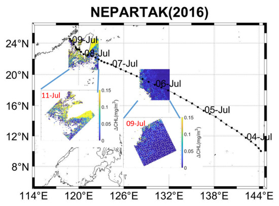Babin et al. [4] examined the passages of 13 hurricanes through the Sargasso Sea in the North Atlantic from 1998 to 2001 based on eight-day composite ocean color images. Their results showed that increased Chl-a within the cold wakes of the hurricanes responded mainly to the injection of nutrients or biogenic pigments entering the upper-layer oligotrophic waters. The wake of increased Chl-a coincided with the distribution of sea surface temperature (SST) cooling. The increase in post storm Chl-a concentration lasted 2–3 weeks before it returned to prehurricane level. These findings by Babin et al. [4] served as the baseline for the systematical understanding of Chl-a response to hurricanes or TC passages [5,6,7,8,9,10].