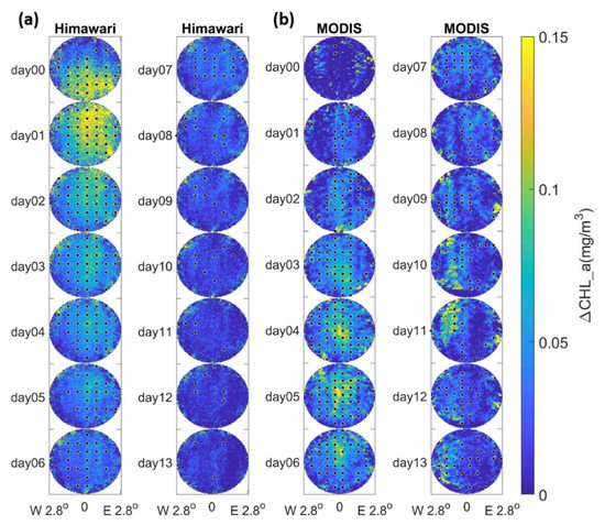 The △CH(i, j) value of MODIS peaks on the fourth day after the typhoon passage with a concentration of 0.0476 mg/m3. The composited TICR gradually reduces back to the initial state. The temporal progression of TICR by MODIS is consistent with those shown in previous studies derived from multiday composites [4,10,17] that peak Chl-a concentration attains to maximum about four days after a certain TC passage (e.g., Wang and Xiu [10]). The rightward bias is observed in the MODIS TICR spatial composites from days 3 to 6 after the typhoon passages. The spatial peaks of TICRs in AHI and MODIS composites shift from the right side to the left side consistently after day 7. Such spatial distributed pattern shows a consistent scenario as reported in Lin and Oey [28], who concluded that the migration of enhanced blooming can be due to heavier (left-side) rainfall freshening the near-surface water. The most marked differences between the spatial characteristics of AHI and MODIS are observed from day 0 to day 3 after the TC passage, which is the period of images collected from sensors onboard polar-orbiting satellites with the worst spatial coverages due to severe weather conditions shortly after the TC passages.
