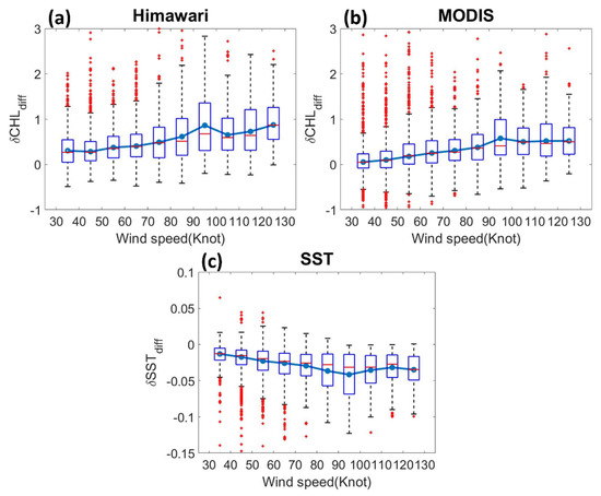 Typhoon-induced Chl-a changes (δCHLdiff) corresponding to different wind forcing strengths calculated on the basis of Equation (3) for (a) AHI and (b) MODIS composites. The change rate of SST (δSSTdiff) corresponding to different wind forcing is shown in (c). The lowest and highest sides of the blue rectangles denote the lower quartile (25th percentile) and upper quartile (75th percentile), respectively. The red line in the rectangles denotes the median. The minimum and maximum bars denote the lower quartile −1.5 × IQR and upper quartile +1.5 × IQR, respectively, where IQR denotes the upper quartile–lower quartile. The red plus signs denote the outliers. Light blue lines connect the means of each interval removing outliers.