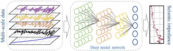 Based on the above strategy, we can obtain multi-scale seismic data in different frequency bands from the original seismic data. In this paper, multi-scale seismic data is extracted from the original seismic data in three frequency bands, called low-frequency, mid-frequency and high-frequency seismic data, respectively. It is worth noting that when extracting high-frequency seismic data, the high cut-off frequency does not exceed 80 Hz to prevent high frequency noise from interfering with the results. Different high cutoff frequency will be set for different data based on the main frequency of the seismic data. Low-frequency initial model is a kind of data often used in conventional seismic impedance inversion methods, which can compensate the problem of insufficient low-frequency information in seismic data and, at the same time, can reduce the multi-solution of inversion results and improve the stability of inversion results. The original seismic data contains all acquisition information. After obtaining the multi-scale seismic data, therefore, it is fed into the deep neural network along with the original seismic data and the low-frequency initial impedance model, as shown in Figure 2. The output, or label, of the network is true seismic impedance model. Given seismic impedance models, we can construct sufficient training data sets by combining forward modeling theory and multi-scale data extraction strategy. The constructed training dataset is fed into a deep neural network to pre-train the network, thus establishing a non-linear mapping function between input and output. The trained network then enables seismic impedance inversion. The proposed method is not limited to a particular deep neural network framework, but can be directly applied to most of the deep neural networks, such as convolutional neural networks, fully connected networks and long short-term memory neural networks, etc.