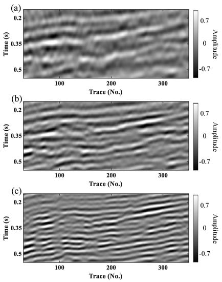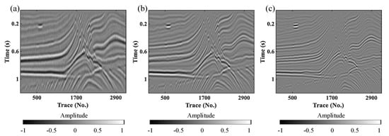 where represents the coefficients of prediction error filter and . The filtering operator is obtained by solving Equation (5), which can then be applied to the spatial trace to obtain the filtered results for frequency f. Once all frequencies have been filtered, inverse Fourier transform is performed to obtain the filtered t-x domain data.