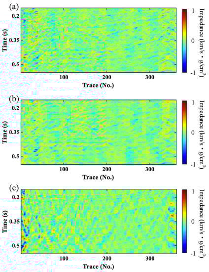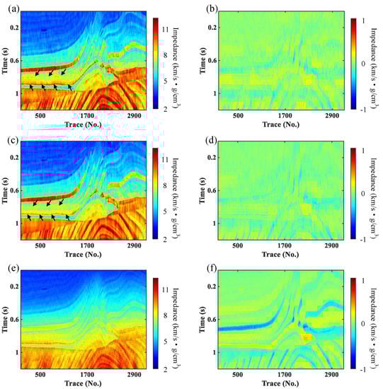 Figure 10a–e show the inversion results of SSII, MSII and MDII without and with f-x filtering, respectively. Blind well-log curves are also projected on the inversion results at the same time to facilitate comparison. The inversion results from all three methods can be well matched to the well-log curves at the blind well location. The data-driven approach yields higher resolution inversion results than the model-driven approach. In addition, the MSII results reveal more details and have better lateral continuity (black arrows) than the those of SSII. The continuity of the inversion results of SSII, MSII and MDII is further improved by the f-x filtering technique, as shown in Figure 10b,d,f. The normalized residual profiles (Figure 11a–c) of inversion results without and with f-x filtering show that the filtering process does not damage the effective signal. It also indicates that MSII has better stability compared to SSII and MDII. These findings are consistent with the conclusions of the synthetic model numerical experiments, which further validates the validity and applicability of the proposed method. Table 2 lists the RMSE between the blind well-log and the inversion results of SSII, MSII and MDII without and with f-x filtering. It is clear that the RMSE of inverted impedance from MSII with f-x filtering is the smallest. In summary, a series of numerical tests show that MSII has the best performance.