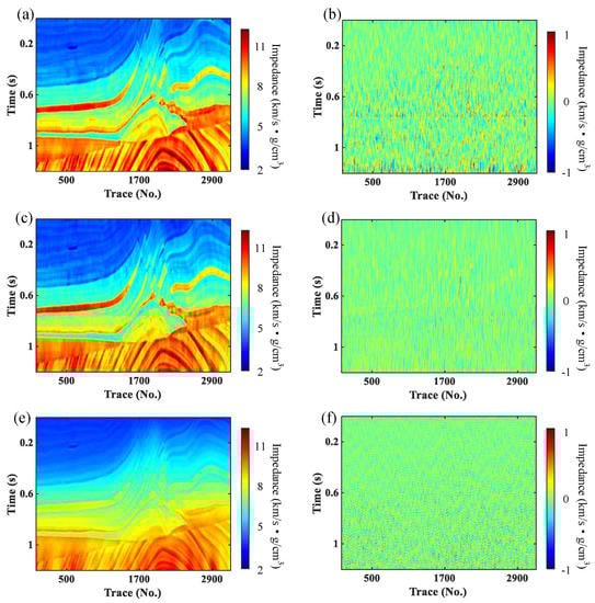 (a) The inverted impedance using SSII without f-x filtering. (b) The residual profiles between SSII inversion results without f-x filtering and reference values. (c) The inverted impedance using MSII without f-x filtering. (d) The residual profiles between MSII inversion results without f-x filtering and reference values. (e) The inverted impedance using MDII without f-x filtering. (f) The residual profiles between MDII inversion results without f-x filtering and reference values.