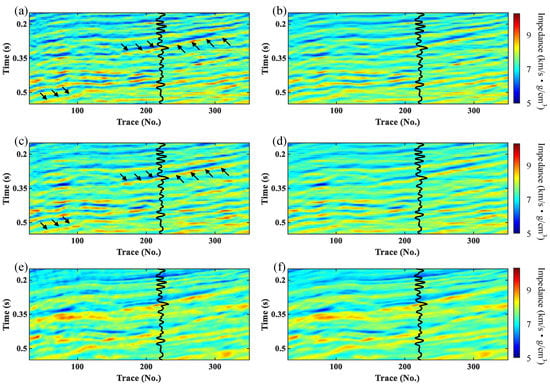 (a) The inverted impedance using SSII without f-x filtering. (b) The inverted impedance using SSII with f-x filtering. (c) The inverted impedance using MSII without f-x filtering. (d) The inverted impedance using MSII with f-x filtering. (e) The inverted impedance using MDII without f-x filtering. (f) The inverted impedance using MDII with f-x filtering.
