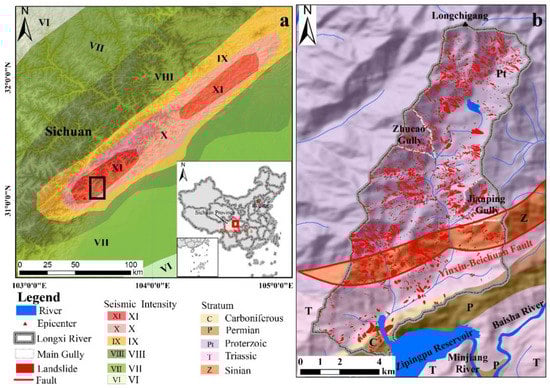 Location of the Longxi River: (a) Mapped zones of seismic intensity along the Longxi River as affected by the Wenchuan Earthquake. The black square represents the area represented within panel. (b) Generalized lithology, faults and the distribution of co-seismic landslides within the main study area.
