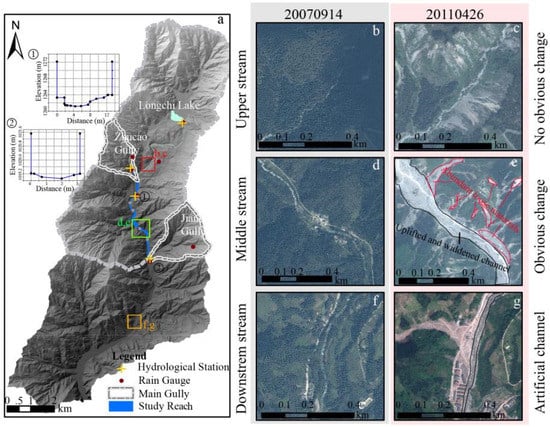 Boundary and characteristics of the study region: (a) shows the location of the study reach and the monitoring system in the study reach, including rain gauge and flow gauge. (b–g) are local remote sensing images before and after the debris flow occurred on 13 August 2010, which show the change in the channel in different periods. (b,c) showed a minor change in the upper stream, (d,e) showed the apparent change and abundant loose materials in the middle stream and (f,g) showed artificial channels in the downstream influenced by a human.