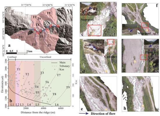 Division of the study channel in Longxi River: (a,b) showed the study channel’s division in Longxi River. L1–L6 represents the different parts along the main channel, and the T1–T9 represents the different tributaries along the river. (c–h) displayed the characteristics of different parts by the UAV image taken on 4 July 2018.