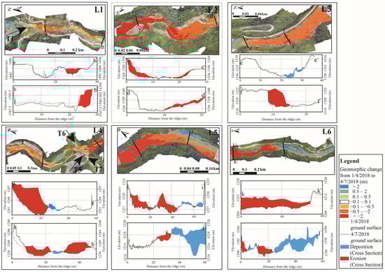 Changes of the channel after this flash flood. L1–L6 represent the geomorphic changes of overall channel parts and cross sections in different parts from upstream to downstream in the study area. Among them, L1 represents the most upstream part and L6 represents the most downstream part. a–a′ to l–l′ represent the cross sections in different parts. T1, T5–T7 represent the tributaries along the study area.