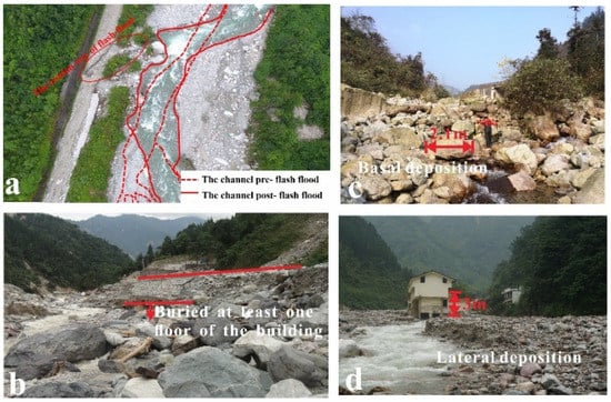Flash floods are one of the most dangerous natural hazards in mountainous regions, which are generally triggered by extreme precipitation, or by a sudden release of water due to a dam break [,]. Extreme rainfall events are the common cause of flash floods worldwide. Numerous studies have documented that extreme floods induce geomorphological channel changes and fluvial landscape development [,], such as widening the channel [,] and changes in channel patterns due to erosion and deposition [,]. A range of methods has been used to analyze the geomorphic responses to large floods, including the reconstruction of the hydrological event [], analysis of hydraulic flood variables [,], mapping of loose deposits [], transportation of deposits [] and quantification of channel changes using field or remotely-sensed data [,,,]. Based on the previous research [], high-quality and quantitative morphological change indicators that relate to and integrate various data sources and methods could provide a deep analysis of the hydrodynamic condition of channel changes. The development of small Unmanned Aerial Vehicles (sUAV) provides an opportunity for quantifying geomorphic response to flash floods and provides more detailed and rapid data to be retrieved on morphological responses in the channel [].