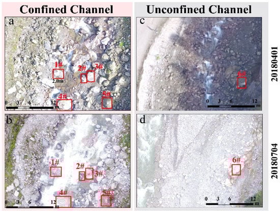 Distribution of grain in different channel part. (a,b) show the coarse layer generated in confined channel, box 1–6 shows the location of reference grains without moving under this flash flood; (c,d) show the unconfined channel with gravel and clay and little boulder.
