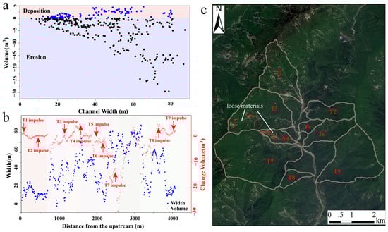 Effect of the channel width and impulse of tributaries to the volumetric change post-flash flood. (a) shows the relationship between channel width and volume change during a flash flood; (b) shows the change of channel width and volume change along the channel with the influence of tributaries inflow; (c) shows the distribution of loose materials in different tributaries.
