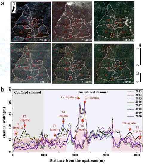 Several researches have shown that the loose soil deposits in earthquake-affected catchments have covered from hillslope to channel and the channel has experienced evolution several times [,]. According to the previous study and the satellite images from GaoFen-1 and Sentinel-2, the events of mass transformation were collected. It was found that there was a milestone in the transformation of mass transportation from the post-earthquake debris flow to the flash flood. Before 2013, several debris flow events occurred at Longxi River recorded by the previous study [,]. To analyze the evolution of the debris flow, several satellite images from 2013 to 2020 were obtained. And the images showed that the land cover remained unchanged after the debris flow occurred on 8 August 2013 (Figure 9a). It shows the mass supply in this period was limited by vegetation recovery. The debris flow was substituted by the flash flood to transport the mass deposited in the channel, which is also supported by the monitoring data []. And according to the extraction of channel width along the main channel at different periods, it shows the channel width was up the maximum after the debris flow occurred on 8 August 2013, and kept this width until 2016. After 2016, the vegetation was recovered at the accumulative body in the channel, and the channel width was reduced. Besides, the tributary influence was also reduced because of the reduced capacity of mass supply from a tributary.