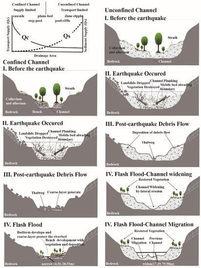 One conceptual model of generalized channel response to floods in an earthquake-affected catchment was put forward based on the Longxi River analysis. The influence of the earthquake on channel evolution can be divided into three stages. In the first stage, a large amount of loose material was produced and transported to the main channel through post-earthquake debris flow, which caused and blocked the channel and consequently uplifted the riverbed. In the second stage, under the effect of post-earthquake debris flow, part of the debris flow material deposited in the channel was removed. The transport-limited process controlled the channel evolution. In the third stage, which has passed a long time after the earthquake, the flash flood was the main external force of erosion or channel accumulation, leading to the loose materials generated by earthquake transport to downstream even outside of the watershed. Because of the difference in supply and transport capacity, the conceptual model divides the post-earthquake geomorphological response of flash floods into three main categories (Figure 10).