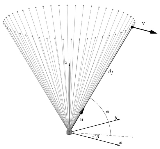 - compute the radial velocity of all 50 beams of those 35 positions for the fixed lidar using Equation (4), i.e., the radial velocity is a function of the velocity components, azimuthal orientation, and opening angle;