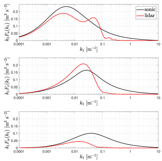 where the subscript i denotes the number of the line-of-sight measurement. Figure 2 shows the velocity spectra of a ZX lidar for a set of Mann parameters assuming m. As illustrated, the spectrum of the three reconstructed velocity components is both ‘contaminated’ by cross-components (easily seen by the multiple peaks) and affected by the averaging effect of the probe volume (decrease in the spectra density with increasing wave number). A way to suppress the contamination was suggested by Kelberlau and Mann [20] and tested on conically scanning lidar data. However, this method requires access to individual line-of-sight velocities.