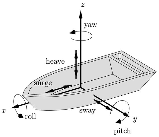 If the buoy only rotates but does not translate, the radial velocities of the buoy VAD lidar would be expressed as , where is the wind’s velocity vector at the new scanned rotated positions. However, a buoy also translates and so the buoy velocities are added to the wind velocities. The velocities induced by the buoy comprise those in the roll, pitch, and yaw directions, i.e., surge, sway, and heave motions, respectively. If these are measured in the buoy’s frame of reference, we need to transform them with the rotation matrix before adding them to the wind velocities. The new radial velocity that the lidar measures is thus