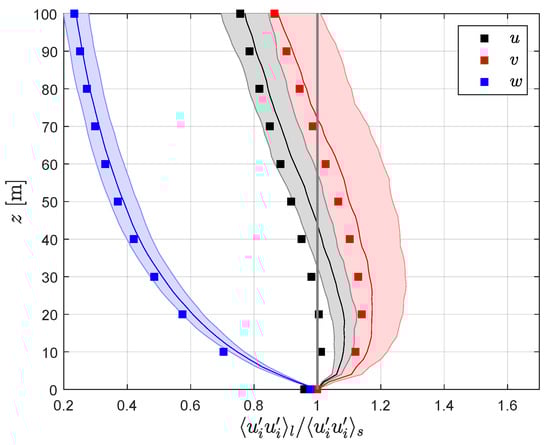 Ratio of the u-, v-, and w-velocity variances measured by a VAD ZX lidar (subscript l) to that measured by an ideal sonic anemometer (subscript s) as function of height. Markers correspond to theoretical predictions, and lines and shaded areas are the mean and standard deviation, respectively, of 100 turbulence boxes.