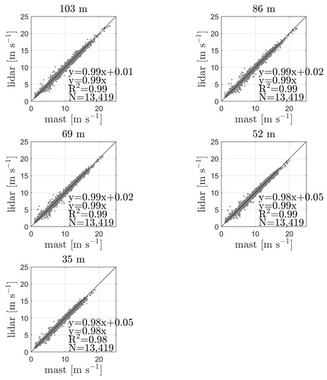Figure 7 shows the comparison between the 10-min means of the ZX lidar reconstructed horizontal wind speeds and those of the cup anemometer at the closest height. As illustrated and expected, the agreement is rather good with the largest bias of ≈2% at the lowest level, where we also find the lowest coefficient of determination R. Although not shown, note that if we include the ≈1500 10-min periods in which the wind speed ratio measured by the ZX lidar is beyond of that measured by the cup anemometers, we find most of these periods above the 1:1 relation in Figure 7. These periods become also more scattered the higher the observed height, thus decreasing slightly the correlation with height.