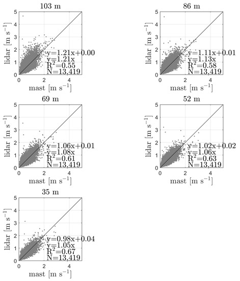 We also show the comparison of turbulence estimates, in this case of the standard deviation of the 10-min reconstructed horizontal wind speeds between the ZX lidar and the closest cup anemometer (see Figure 8). As illustrated, turbulence measured by the ZX lidar is generally larger than that of the cup anemometer at all heights. The bias between the measurements is within 18–19% at all levels. The correlations are not as high as those of the mean wind speeds in Figure 7 and they decrease slightly with increasing height.