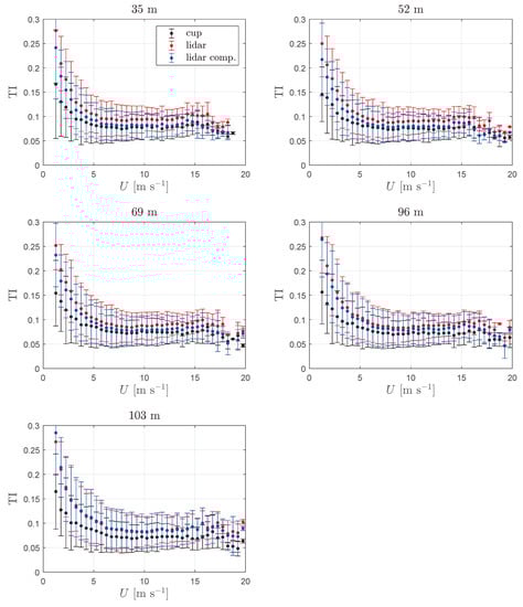 We also present the results of the ‘turbulence’ compensation by illustrating the TI computed at several horizontal wind speed bins for each of the measured heights (Figure 11). At 35 m, the floating ZX lidar compensated TI is lower than the floating ZX lidar original TI for all velocity bins. One can notice that the floating ZX lidar compensated TI becomes closer to the cup-based value within the wind speed range 5–15 m s when compared to the wind speed range 1–5 m s. The difference between the cup and floating ZX lidar (compensated or not) TI estimates tends to increase the lower the wind speed, where the TI estimates based on all instruments also increase. The increase in TI within the low speed range is generally due to the influence of atmospheric stability as stable and unstable conditions concentrate within this wind speed range. This influence diminishes with increasing wind speed as neutral atmospheric conditions become dominant under high wind conditions. Assuming the logarithmic wind profile (Equation (18)) and that , . Thus, assuming mm, TI is between 0.083 and 0.076 within the measurement levels (35–103 m), which are close to the values that TI asymptotically reaches beyond m s in Figure 11. Within the wind speed range 1–5 m s, probe volume and cross-contamination effects can be different than those estimated with the turbulence boxes used to estimate the turbulence errors. This is because both the anisotropy and length scale that one could obtain from the measurements within this speed range might be different to those used for generating the Mann model turbulence boxes in which the floating lidar is simulated ( and m).