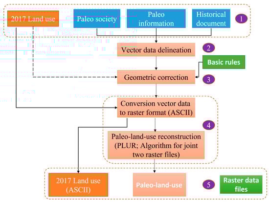The Paleo-Land-Use Reconstruction (PLUR) program is a Fortran-based algorithm for combining two raster data files []. It aims to reconstruct the historical land use of the target area based on historical information (historical social structure, historical environment, historical ancient books, historical maps, historical documents, etc.). The reconstruction of historical land use through PLUR requires 5 steps (Figure 2), which are described in detail below: