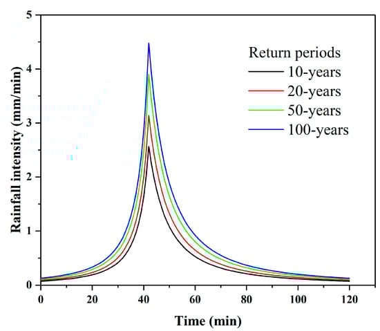 The Chicago rain type method uses the peak ratio to express the ratio of the peak at present time to rainstorm time. According to the results of the study of Bi Xu et al. [], the value range of the peak ratio in Xi’an is 0.31731–0.49679. This study selected the peak ratio as 0.35. The design of the rainstorm is shown in Figure 4. The designed rainstorm intensity of each return period was 25 mm/h (10-year return period), 30 mm/h (20-year return period), 38 mm/h (50-year return period), and 44 mm/h (100-year return period).