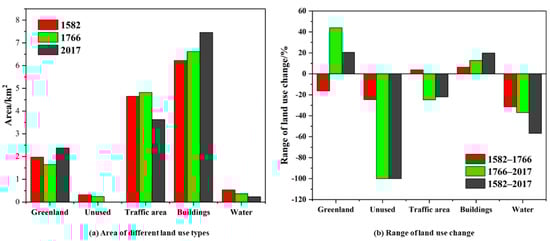In the three periods, the main land use types within the Ming city wall of Xi’an were green space, traffic area, and buildings. From 1582 to 1766, the largest increase was for buildings, and the largest decrease was for water bodies, followed by unused land and green spaces (Figure 6). The increased buildings are mainly converted from roads, urban green spaces, and water bodies, and the decreased water bodies are mainly converted to buildings (Table 3).