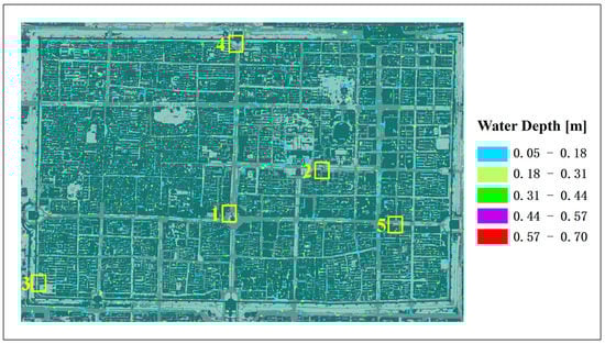 The simulation results are shown in Figure 7 (ignoring water depths of less than 5 cm). In combination with Table 5, it can be found that the water depth of the water points marked in Figure 7 is largely consistent with the measured results. The minimum relative error between the measured and simulated results is 4.0%, and the maximum relative error is 8.8%. This shows that the parameters of the model are reasonable and have good applicability to the simulation of surface inundation in the study area.