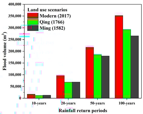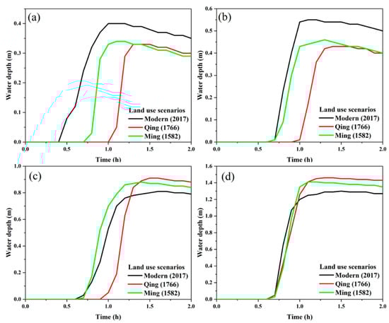 Observing the land use maps of the three eras, we can see that the distribution of buildings in the Ming and Qing dynasties is less dense than that of modern times. In addition, in the Ming Dynasty, the distribution of buildings was more concentrated, and the density was less than that of the Qing Dynasty. According to previous studies [,], the surface confluence time of rainwater will increase with the increase in building density. According to this point of view, as the building area and density in the land use situation of the Ming Dynasty in this study were the smallest, this period should reach the peak of submergence first. But compared with ancient times, the underlying surface has changed greatly in modern times. Modern roads and building land are almost completely impermeable surfaces, while in the Ming and Qing dynasties only the main roads had a hardened surface. A hardened road surface has less roughness. A more hardened road surface is certainly more conducive to rainwater pooling []. Therefore, the inundation depth of modern land use is the quickest to reach a peak under the rainfall scenarios of 10- and 20-year return periods. However, under the rainfall conditions of 50- and 100-year return periods, due to the increase in rainfall intensity, the influence of roughness on catchment time was no longer significant, so the flood peak was reached first under the land-use conditions of the Ming Dynasty.
