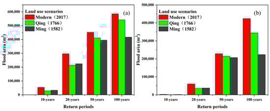 Under the scenario of 10-, 20-, and 50-year rainstorm recurrence periods, the inundation area in the Qing Dynasty and the Ming Dynasty was largely the same (Figure 9). However, under the scenario of the 100-year rainstorm recurrence period, the inundation area of the Qing Dynasty was far greater than that of the Ming Dynasty.